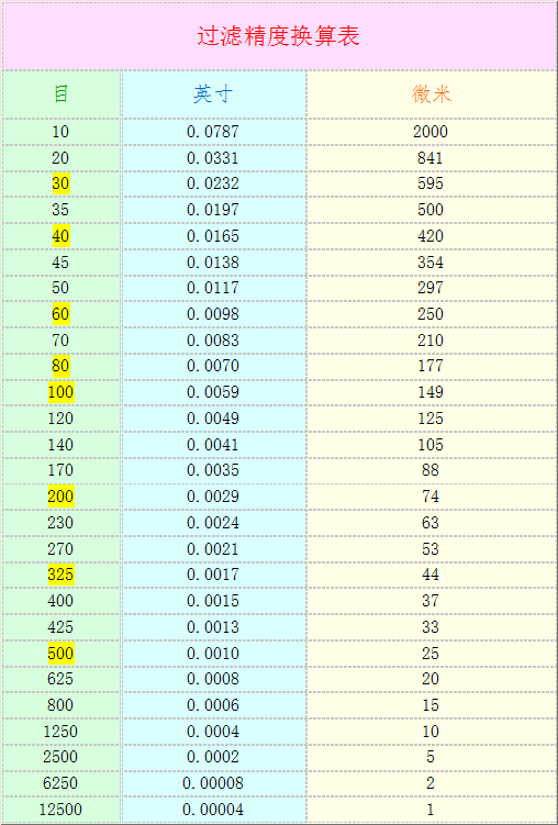 常用過濾精度換算表